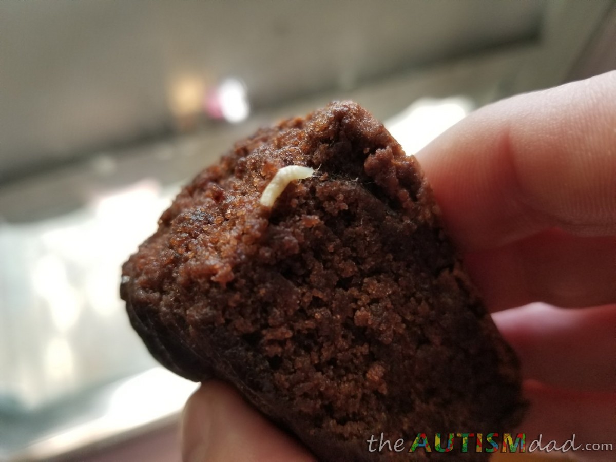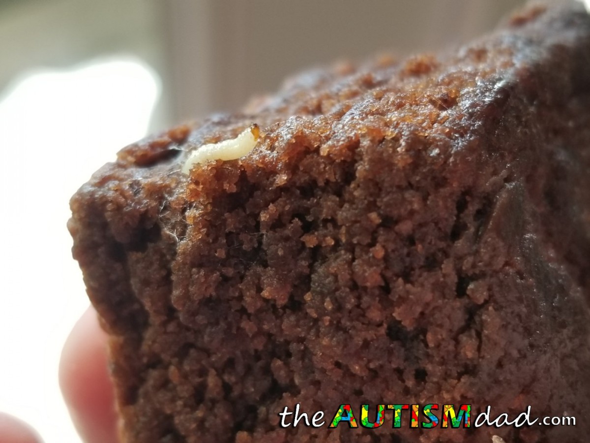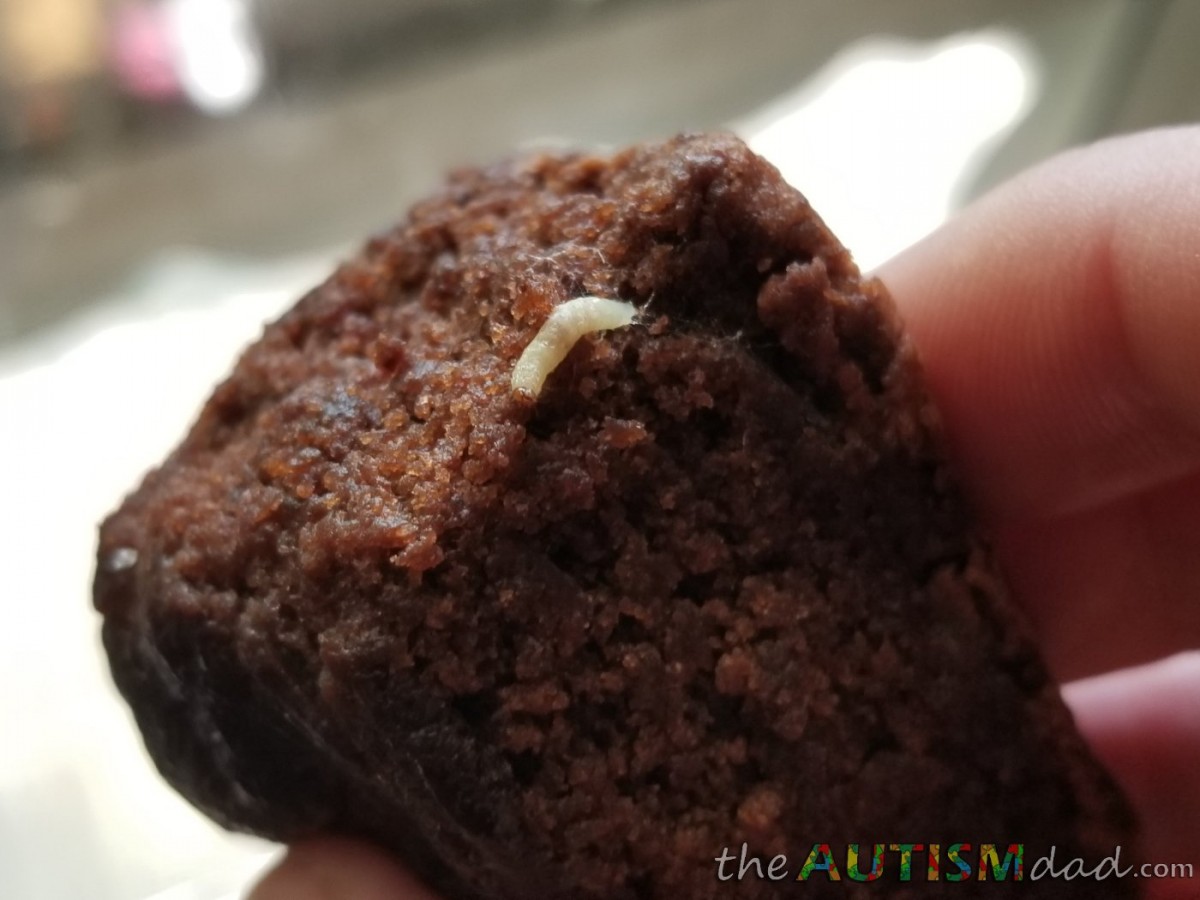 If you’re asking yourself if that’s a maggot, it is. That’s a maggot. It’s been in there for a little while because you can see where it had been living and the sorta slime trail it left as it burrowed through the brownie.